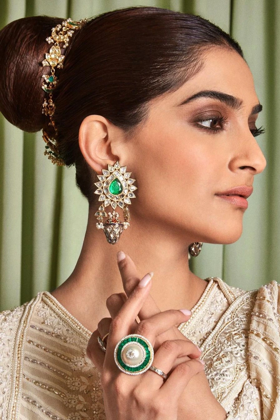 The festive make up of Sonam Kapoor has a high fashion appeal and experimental elegance. Her appearance is perfect to those people who like modern styling in traditional clothes.